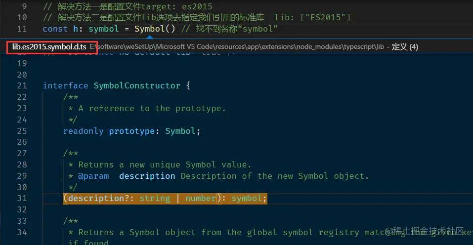 标准库是内置文件对应的声明,配置文件中默认的版本是es3,所以类型声明类似Symbol、Promise会报错,在某种情况下Array、console也可能会报错,这个时候要让程序认识那些个类型,在VSCode中,类型右键跳转定义可以看到lib文件夹里面有很多内置对象的定义,这就是TypeScript标准库,以Symbol为例: