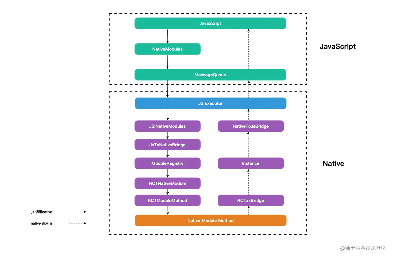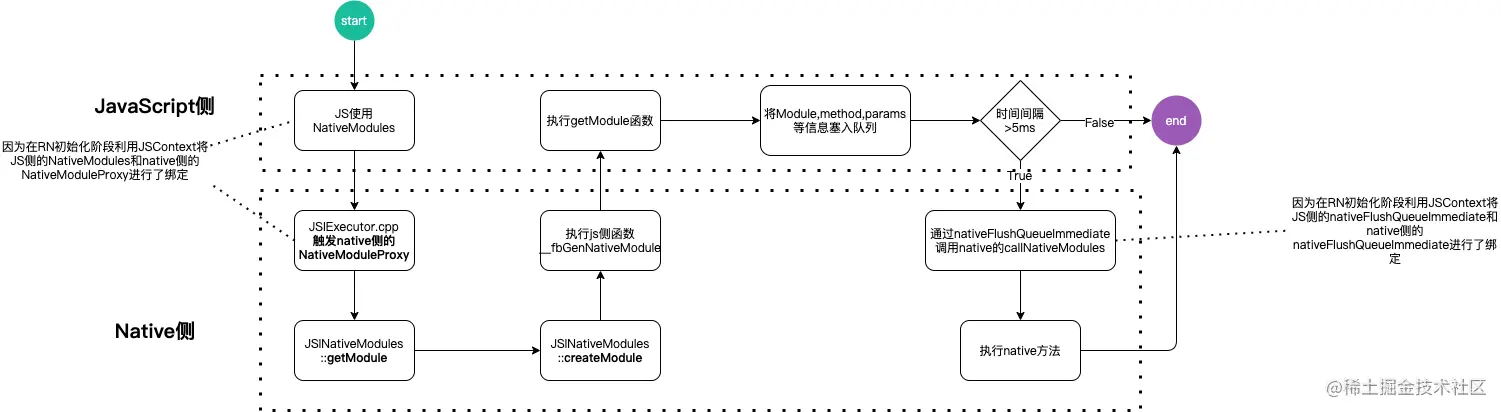 NativeModules(NativeModules == global.nativeModuleProxy == native 的 NativeModuleProxy)调用 native 侧的getModule->createModule直到调用到js侧的__fbGenNativeModule也就是 js 侧的getModule函数; -