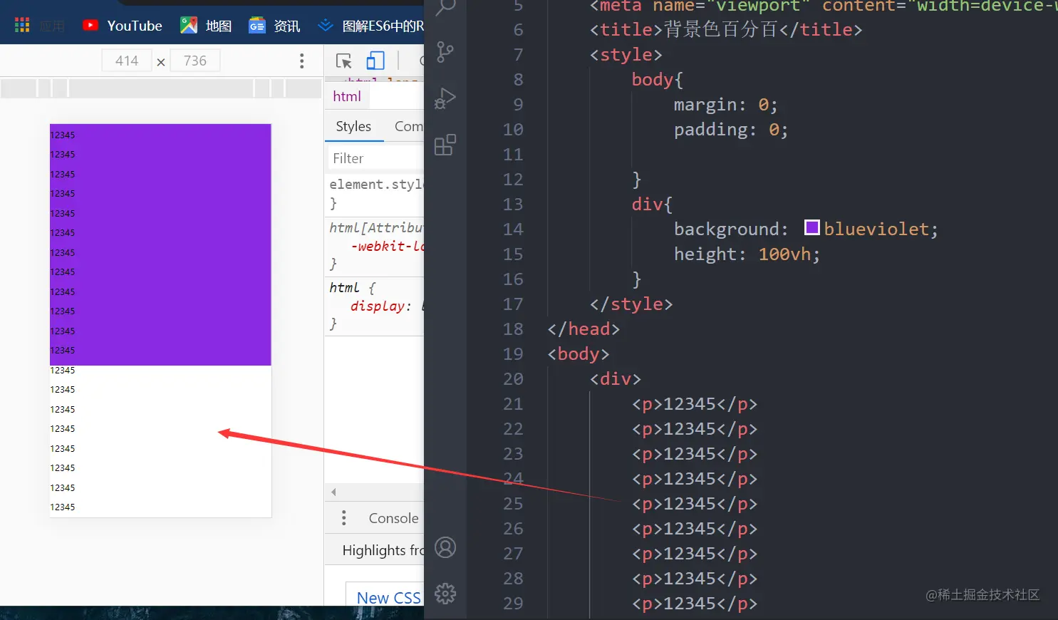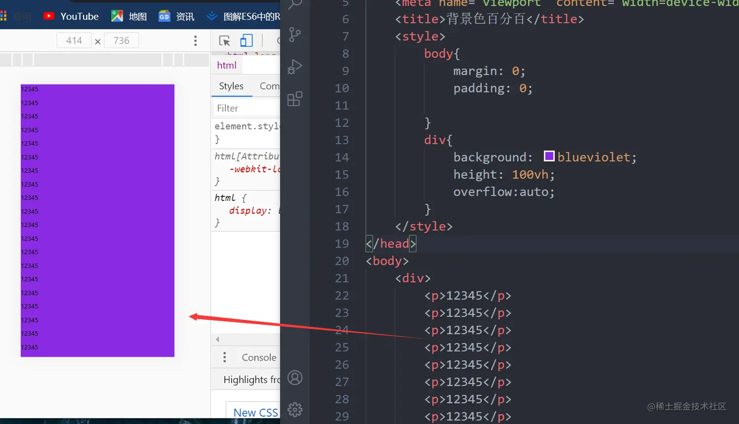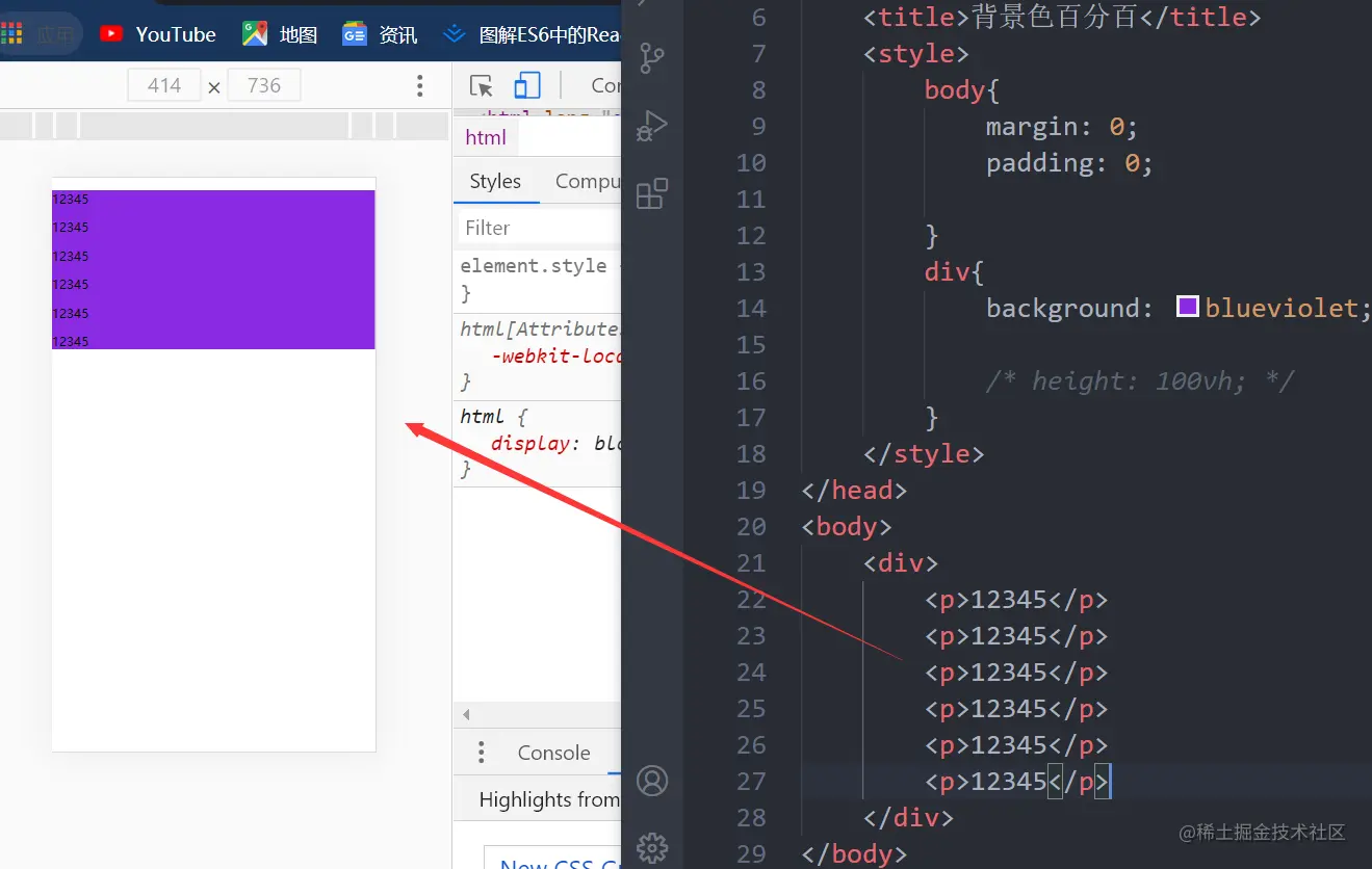 div中背景色百分百 张亚博 2020-12-01 273 阅读1分钟 当我们在做移动端开发时,有时某几个页面的需要特定背景色时 (1)当我们不给div设置高度,只设置背景色。会出现背景色的高度是由内容的高度撑起来的 (2)当我们设置div的高度为100vh时,但同时我们的内容溢出时,会出现溢出的部分仍是白色 总结: 添加overflow:auto