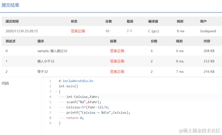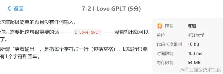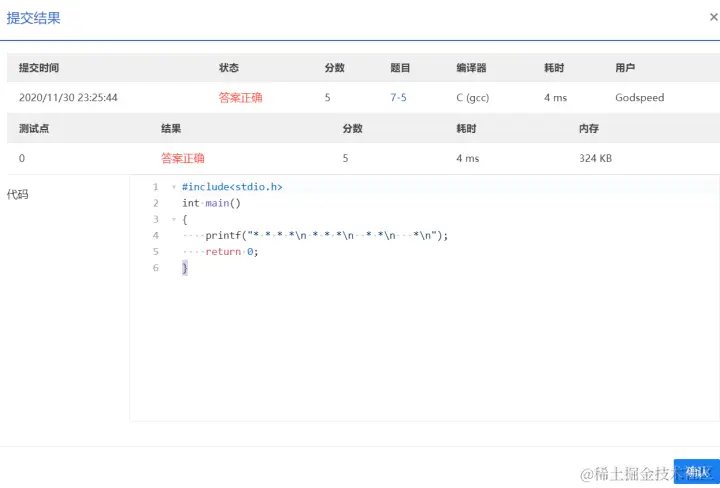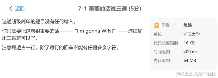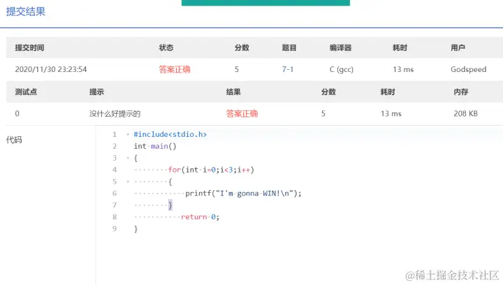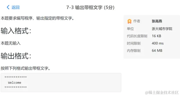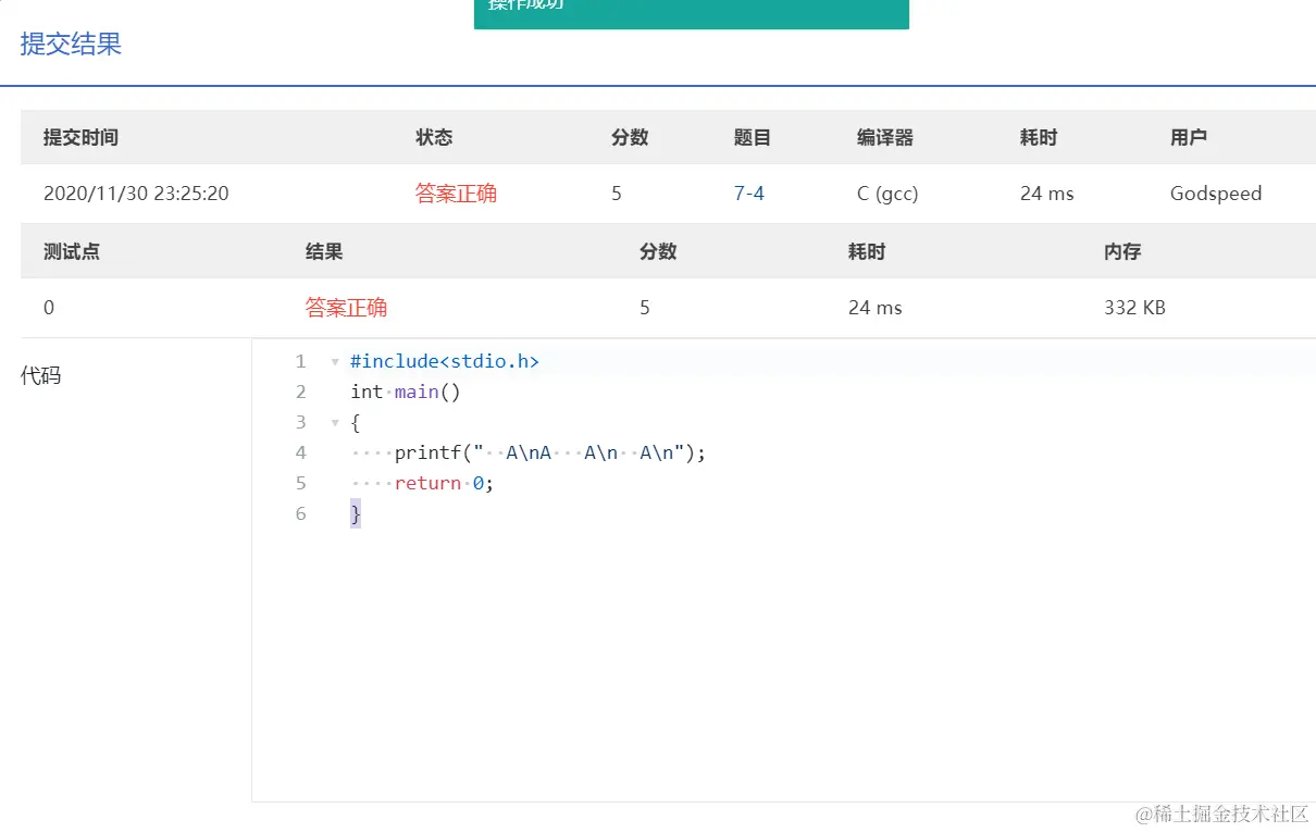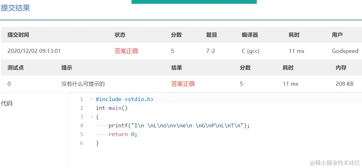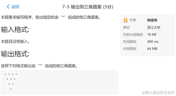 PTA第I段编程题 GodspeedLeslie 2020-12-01 177 阅读1分钟 7-1 重要的话说三遍 使用一个for循环 7-2 I Love GPLT 此处使用了转义序列\n换行 7-3 输出带框文字 7-4 输出菱形图案 7-5 输出倒三角图案 7-6 厘米换算英尺英寸