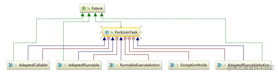 ForkJoinTask 实现了 Future 接口,说明它也是一个可取消的异步运算任务,实际上ForkJoinTask 是 Future 的轻量级实现,主要用在纯粹是计算的函数式任务或者操作完全独立的对象计算任务。fork 是主运行方法,用于异步执行;而 join 方法在任务结果计算完毕之后才会运行,用来合并或返回计算结果。 其内部类都比较简单,ExceptionNode 是用于存储任务执行期间的异常信息的单向链表;其余四个类是为 Runnable/Callable 任务提供的适配器类,用于把 Runnable/Callable 转化为 ForkJoinTask 类型的任务(因为 ForkJoinPool 只可以运行 ForkJoinTask 类型的任务)。