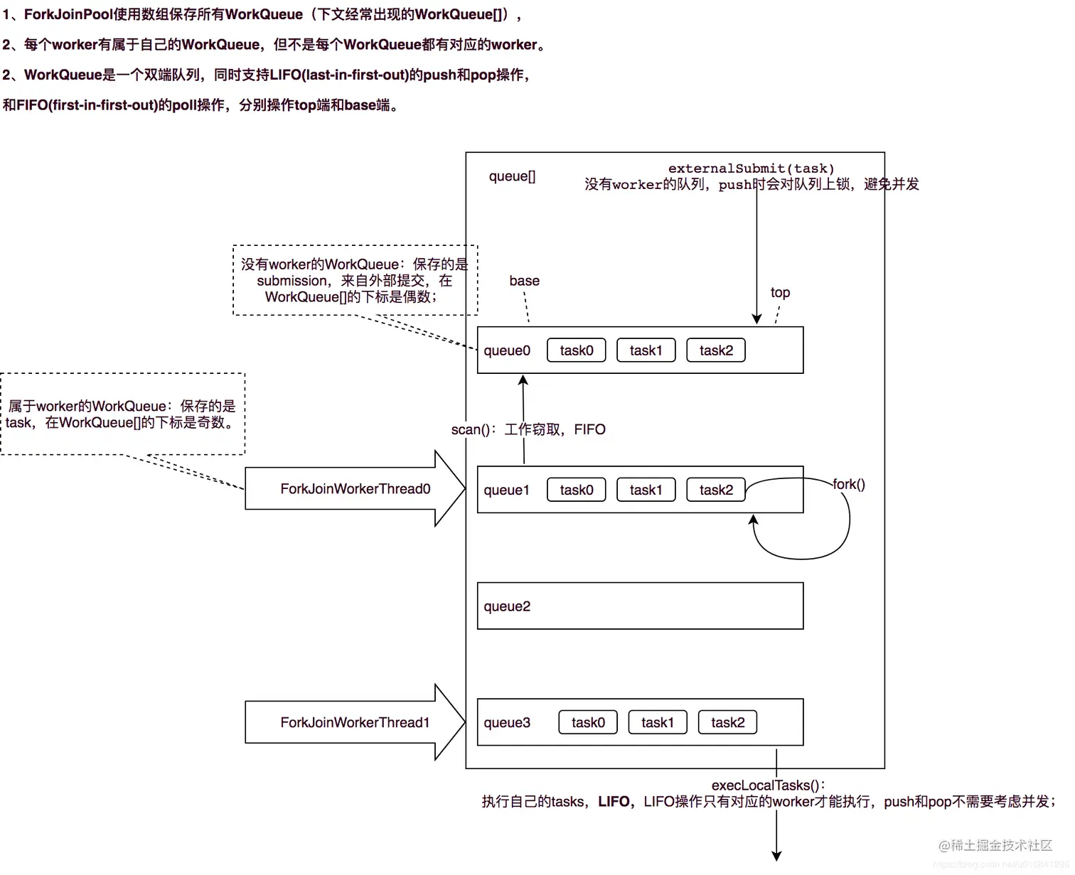 在 ForkJoinPool 中,线程池中每个工作线程(ForkJoinWorkerThread)都对应一个任务队列(WorkQueue),工作线程优先处理来自自身队列的任务(LIFO或FIFO顺序,参数 mode 决定),然后以FIFO的顺序随机窃取其他队列中的任务。