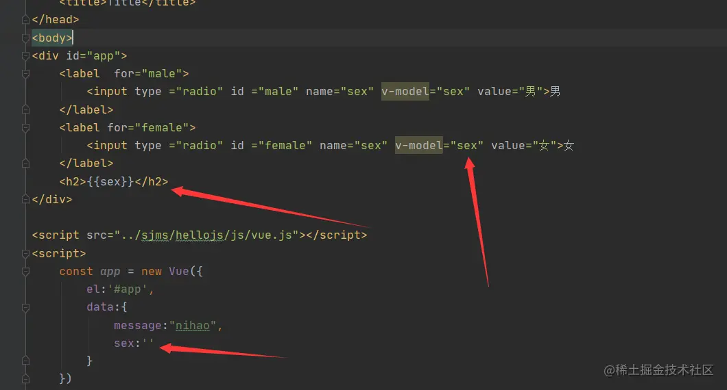v-model结合radio使用: