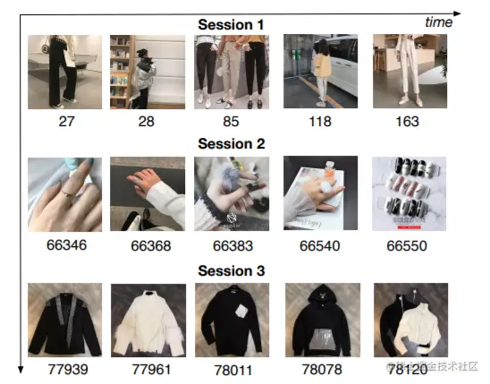 论文以30min为一个session间隔,将用户行为序列中30min以内的物品元素归为一个session,依次间隔类推,进而将整个用户行为序列划分为一个个session。从论文提供的示意图中可以看到,一个session内,用户的兴趣基本没有变化,因此浏览的物品类别也保持一致。