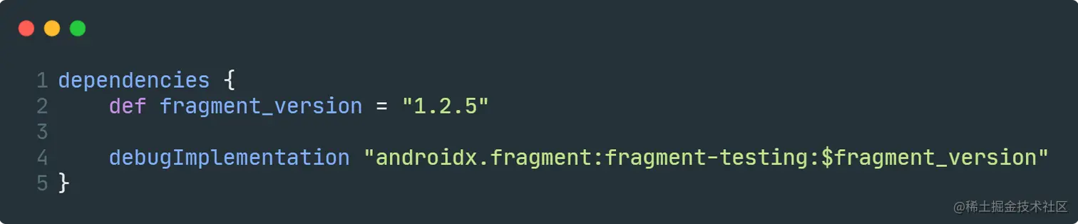 要使用 FragmentScenario,请使用 debugImplementation 在 app 的 build.gradle 文件中定义 fragment 测试工件,如下所示: