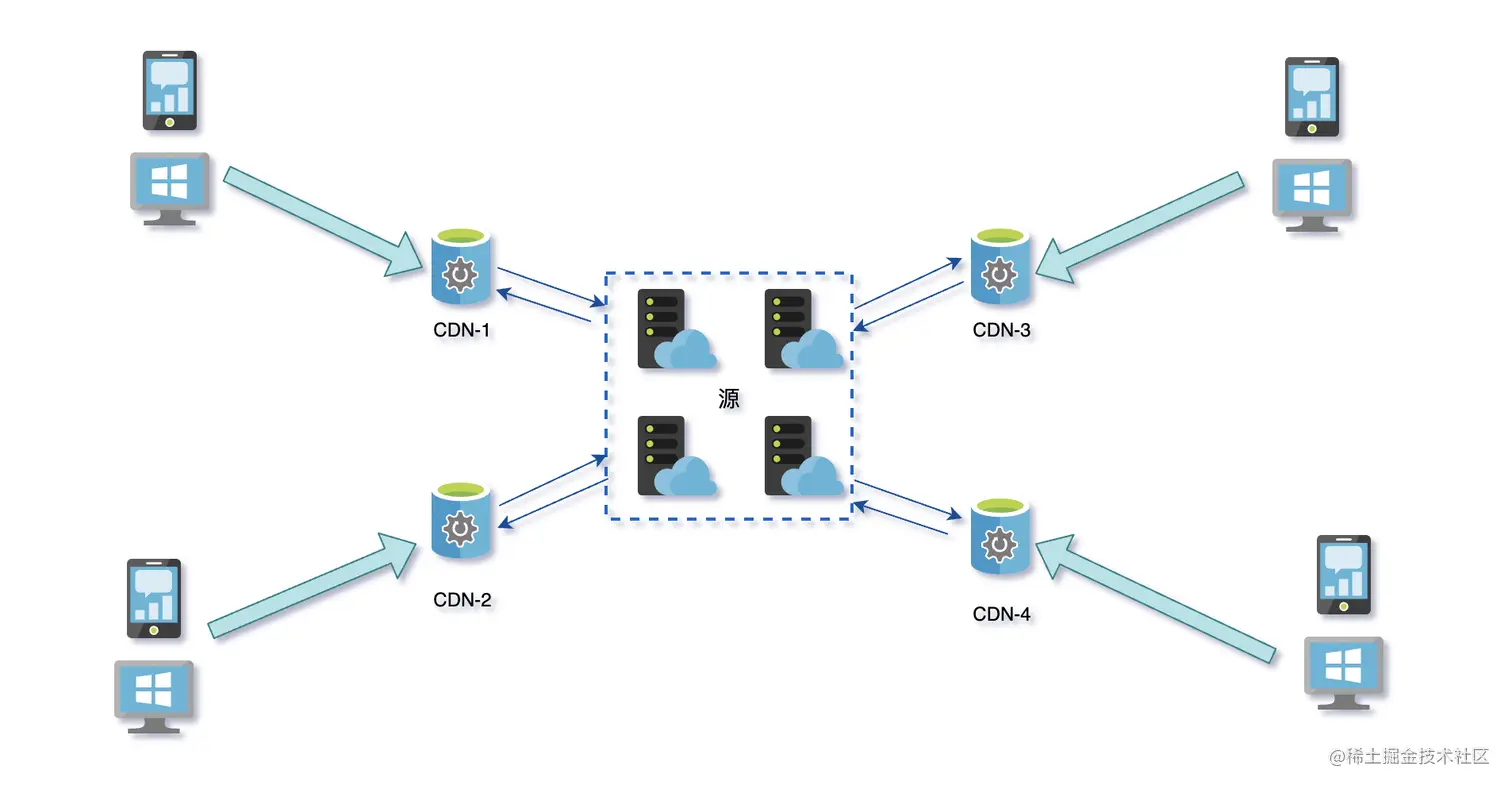 CDN 的核心就是加快网络访问速度,看下面这张图,不同地方的终端用户会访问到最近的 CDN 服务器,而 CDN 服务器上的内容是源服务器集群上的,不管是通过主动拉取还是被动接收的,总之数据内容是一致的,而且离用户最近,获取成本最小速度更快。