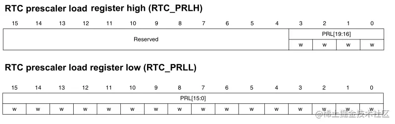 2.3 RTC 预分频装载寄存器——RTC_PRLH 寄存器和RTC_PRLL 寄存器