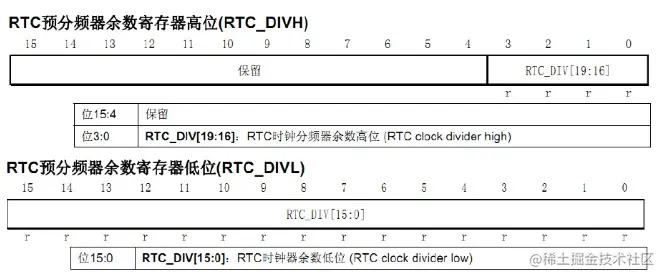 2.4 RTC 预分频器余数寄存器——RTC_DIVH 寄存器和RTC_DIVL 寄存器