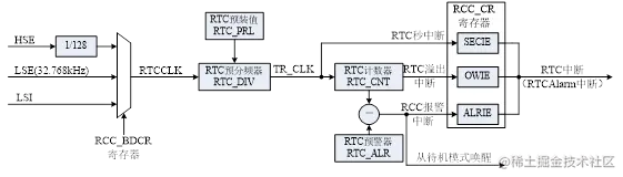 图中浅灰色的部分都是属于备份域的,在VDD掉电时可在VBAT的驱动下继续运行。这部分仅包括RTC的分频器,计数器和闹钟控制器。若VDD电源有效,RTC可以触发RTC_Second(秒中断)、RTC_Overflow(溢出事件)和RTC_Alarm(闹钟中断)。闹钟事件是在计数器RTC_CNT的值等于闹钟寄存器RTC_ALR的值时触发的。