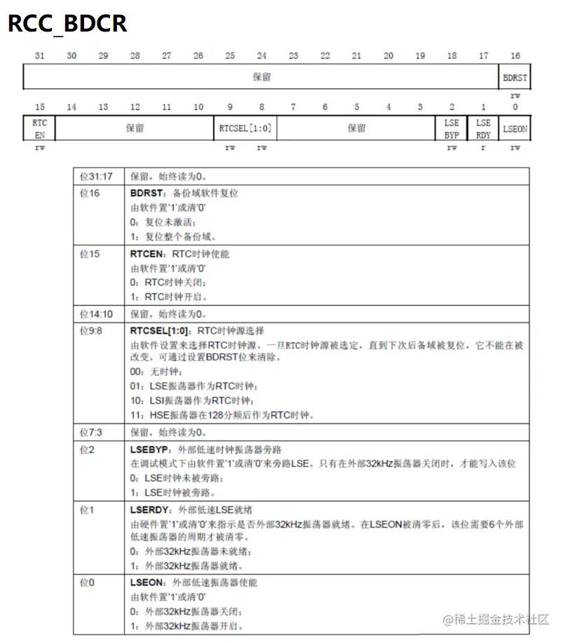 RTC 的时钟源选择及使能设置都是通过这个备份区域控制寄存器RCC_BDCR来实现的,所以我们在 RTC 操作之前先要通过这个寄存器选择 RTC 的时钟源,然后才能开始其他的操作。