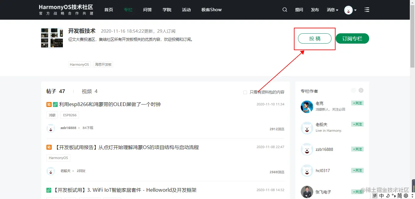 按自己的文章类型找到相应的专栏位置,点击“投稿”。