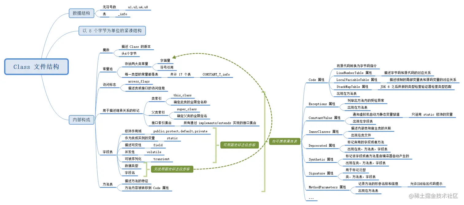 而表是由多个无符号数或者子表构成的复合数据类型,命名上都会以 _info 后缀来结尾。整个 Class 文件也可以被视作一张描述了一个类的所有信息的总表。Class 文件的大致结构如下表所示,从命名上能推测它大致描述了类的这些信息:文件版本号,常量池,访问标志,类信息,父类信息,接口信息,字段域,方法域,以及 "属性"。在后文我们会探讨各个数据项所表示的意义。