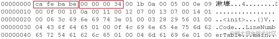 下图是使用装载 Hex-Editor 插件的 Notepad ++ 打开其编译出的 Class 文件的显示结果: