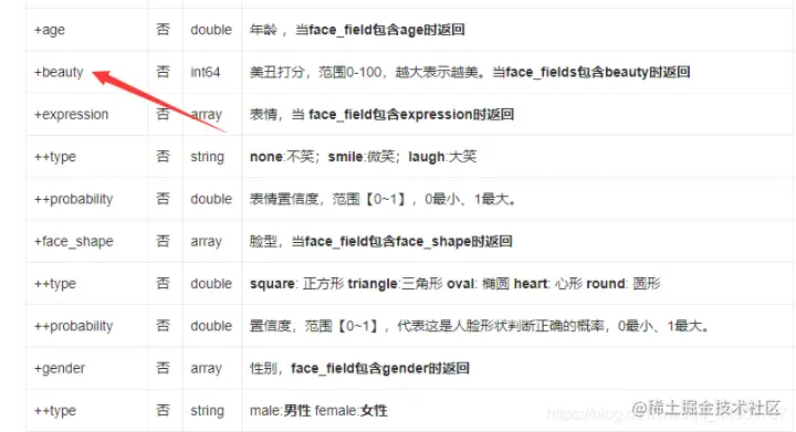 face_field参数,默认只返回人脸框、概率和旋转角度。如果需要返回更多结果,可以在此参数中添加(beauty、age等)。