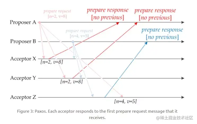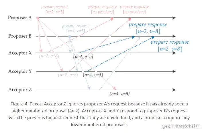 如下图,Acceptor Z 收到 Proposer A 发来的 [n=2, v=8] 的提议请求,由于之前已经接收过 [n=4, v=5] 的提议,并且 n > 2,因此就抛弃该提议请求;Acceptor X 收到 Proposer B 发来的 [n=4, v=5] 的提议请求,因为之前接收到的提议为 [n=2, v=8],并且 2 <= 4,因此就发送 [n=2, v=8] 的提议响应,设置当前接收到的提议为 [n=4,v=5],并且保证以后不会再接受序号小于 4 的提议。Acceptor Y 类似。