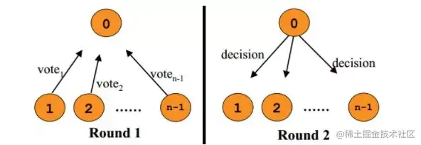 引入主节点,通过竞选。节点类型:Follower、Candidate 和 Leader Leader 会周期性的发送心跳包给 Follower。每个 Follower 都设置了一个随机的竞选超时时间,一般为150ms~300ms,如果在这个时间内没有收到 Leader 的心跳包,就会变成 Candidate,进入竞选阶段。