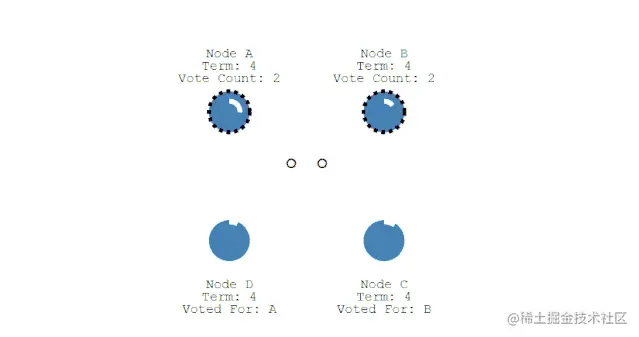 ① 如果有多个 Follower 成为 Candidate,并且所获得票数相同,那么就需要重新开始投票,例如下图中 Candidate B 和 Candidate D 都获得两票,因此需要重新开始投票。
