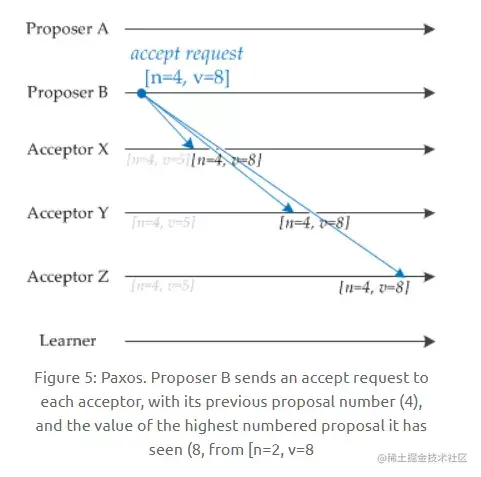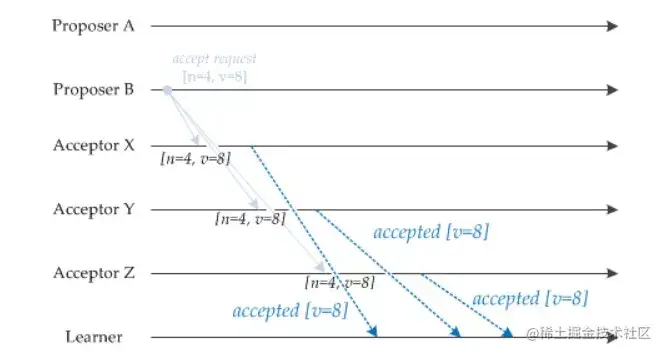 Proposer B 过后也收到了两个提议响应,因此也开始发送接受请求。需要注意的是,接受请求的 v 需要取它收到的最大 v 值,也就是 8。因此它发送[n=4, v=8] 的接受请求。