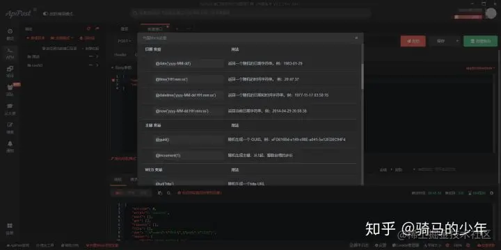 然后在json中引用mock,引用格式"变量名":"mock变量名",直接复制内置mock变量名字就可以了。