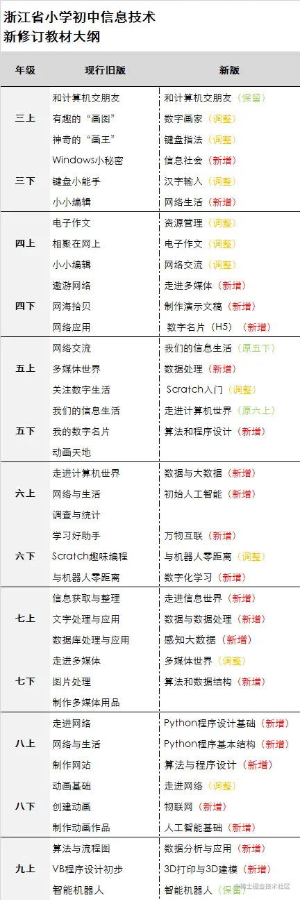 浙江省今年9月份开始的新学期,三到九年级信息技术课将同步替换新教材,其中,八年级将新增Python课程内容。新高一信息技术编程语言由VB替换为Python,大数据、人工智能、程序设计与算法等内容按照教材规划五六年级开始接触。