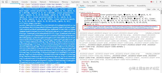 从哔哩哔哩网站中审查元素上就可以看到,在播放器 元素上有一层弹幕蒙版