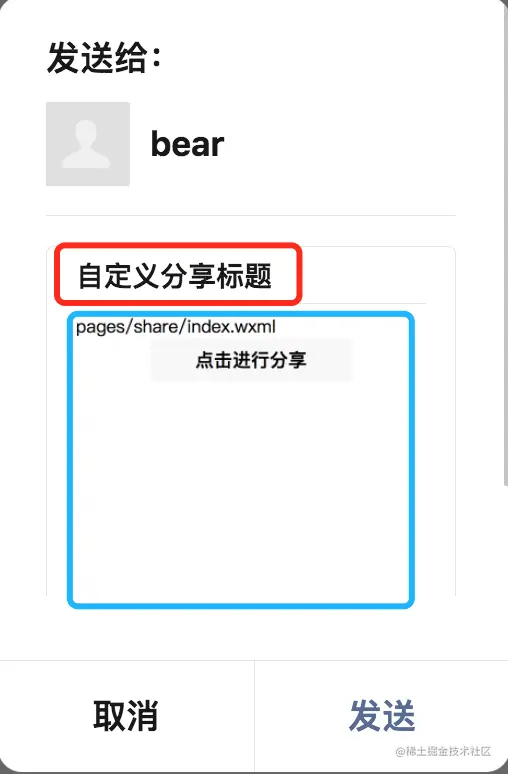 以下示例代码自定义了分享内容的标题和点击之后打开的路径: