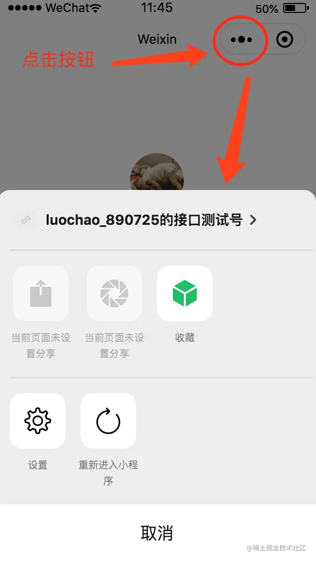 小程序的顶部有一个胶囊按钮,点击第一个按钮便会在屏幕下方弹出菜单列表,其中变包含了分享相关的操作,如下图所示: