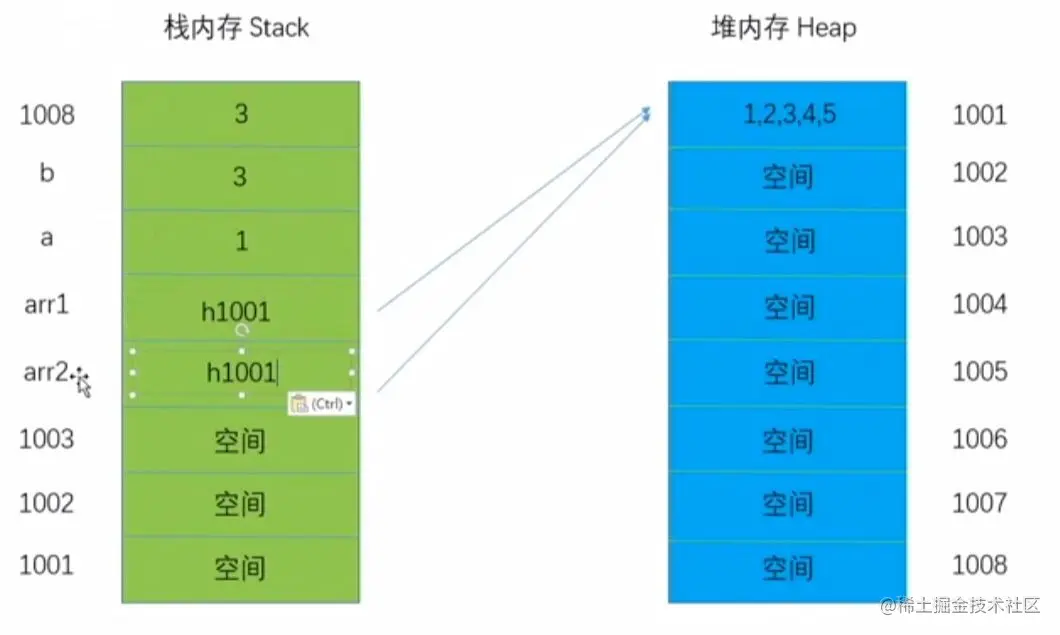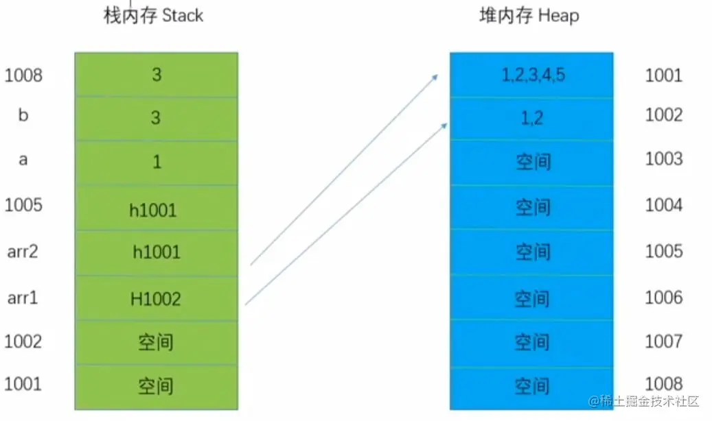 arr=[1,2];/在栈内存中声明一个新空间arr1,并且值存在于堆内存中,在新的arr1的空间中存储新的地址,这时候调用arr1和arr2分别指向不同的地址 所以值也不同