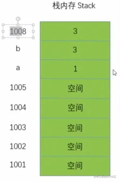 b输出的值为3,与a的值不同。 因为给原始值赋值时,会在栈内存中开辟一个新的内存空间,如果想更改一个原始值的值时,会重新开辟一个内存空间进行赋值,原有的内存空间还存在于栈内存中(所以说手机数据不会完全删除)