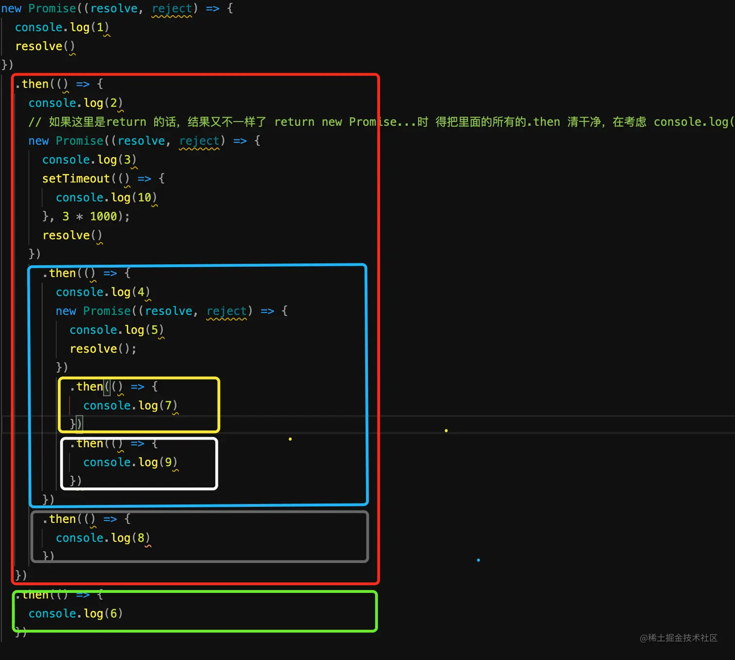 [红框]:清红框,执行到resolve(输出 2,3,中间遇到settimeout,放入宏任务),遇到微任务-蓝框,放入队列,然后红框算是清空了,对应的响应红框.then 的绿框放入队列。