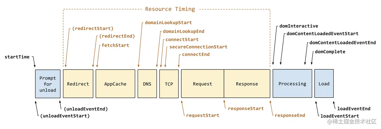 将相关时间节点相减就能得到相应过程的耗时。 作为开发,我们通常更关注从服务器读取的时间,所以取 fetchStart 为起点。 下面是一些常用的时间计算: