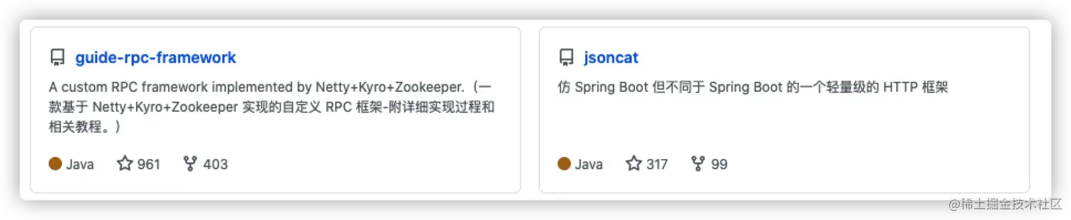 除了 JavaGuide, 我还开源了一些自己写的轮子和一起其他比较有趣的项目。比如今年我就写了一个 RPC 框架和一个 HTTP 框架。