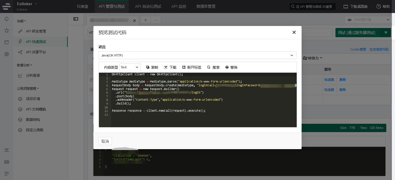 另外,eolinker还提供了快速生成测试代码功能,点击cookie管理右侧的生成测试代码按钮,可以设置生成多种语言测试代码,使用起来非常方便且易上手。