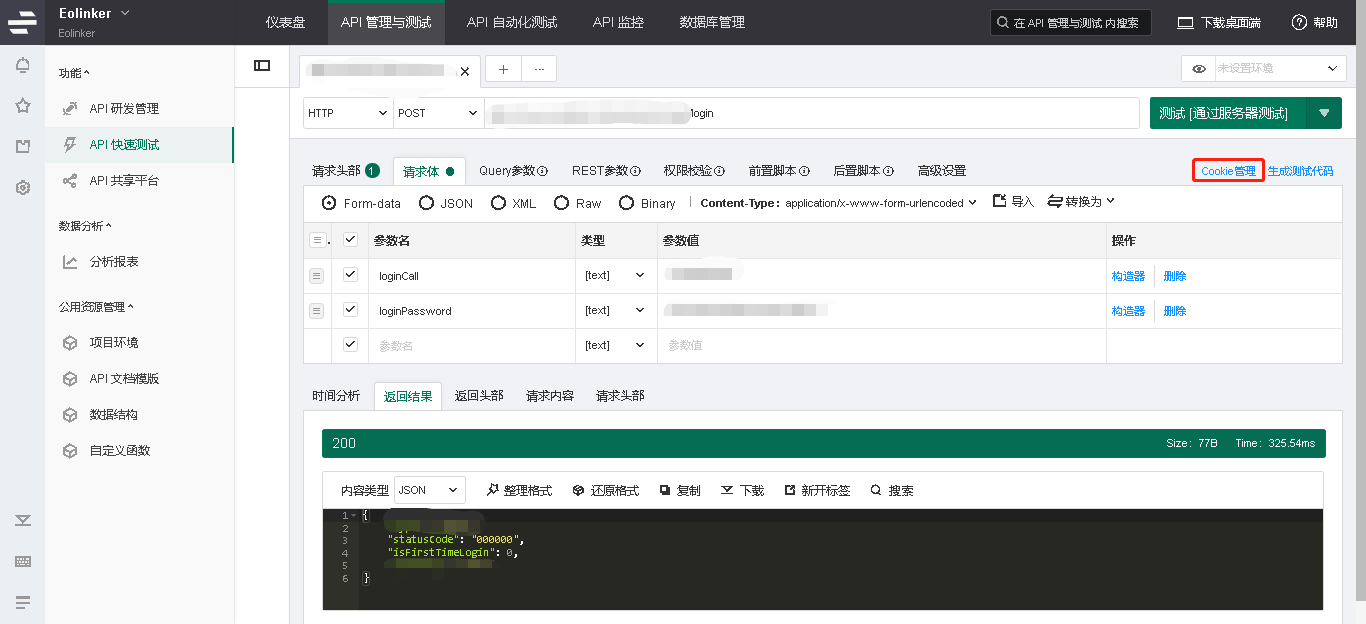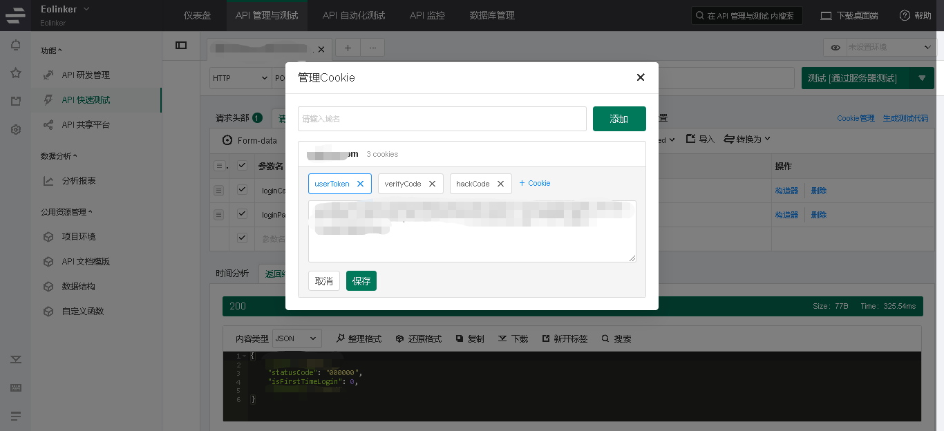 测试成功后,eolinker会自动保存cookie,点击上图红色框框cookie管理,即可看到cookie信息。该cookie信息可以用于流程测试的下个步骤,用于判断登录状态。
