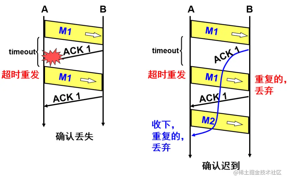 其实我们可以采用超时重传:A为每一个发送的分组都设置了一个超时计时器,A只要在计时器到期前收到B的确认就会撤销计时器,继续发送下一个分组M2。而如果B对M1的确认丢失了,A在设定的时间内无法收到确认,但是A不知道消息是自己发送的时候出错或丢失了还是B在返回确认的时候丢失了。所以超时之后就要进行重传M1。