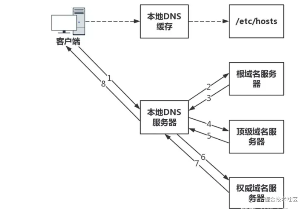 一个完整的过程就是 客户端 --------> 本地域名服务器 ------> 根域名服务器 ----返回----> 本地域名服务器 -------->顶级域名服务器 ----返回----> 本地域名服务器 -------->权威域名服务器 ----返回---->本地域名服务器 ----返回----> 客户端
