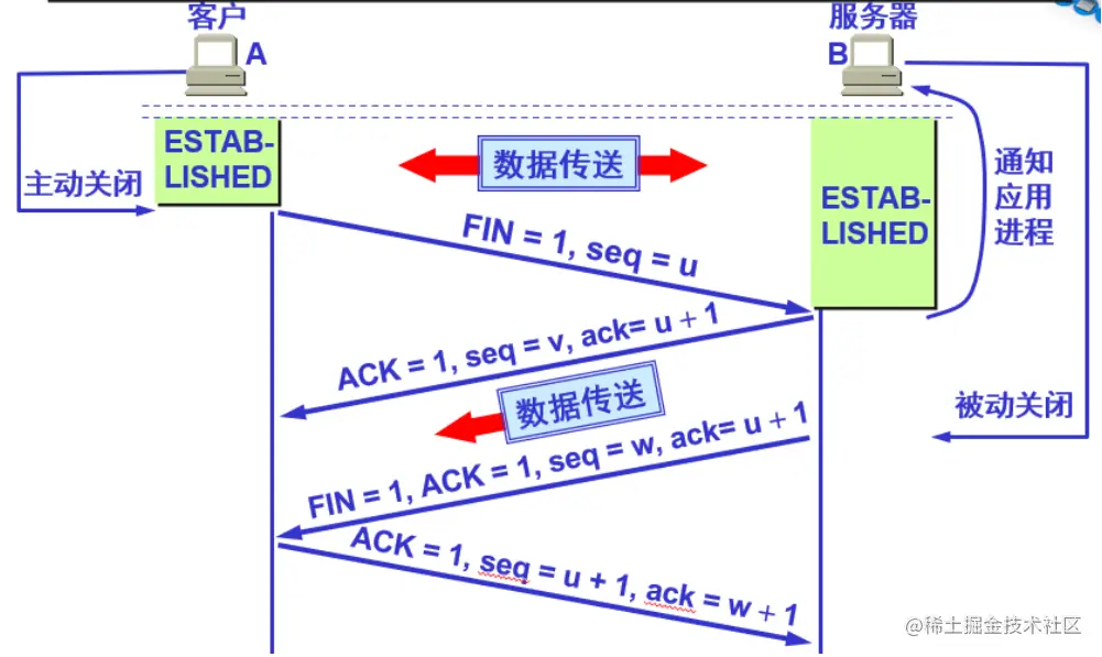 - 第三步:B若发送数据,A仍要接收。若B没有向A发送的数据,其进程就要通知TCP释放连接,将完成态FIN=1,确认态ACK=1,序号seq=w,确认号ack=u+1发送给A