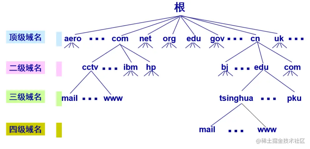 看一张互联网的域名空间图,可以看到这是一个树结构,域名层级从上到下递减。对应的分别是域名从右到左的顺序,例如www.baidu.com -> com是顶级域名,baidu是二级域名,www是三级域名