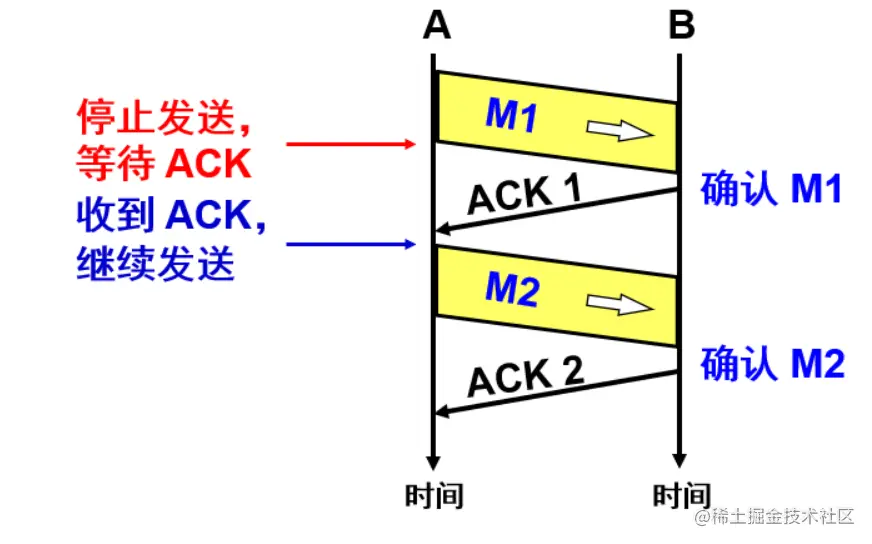 而如果接收方B检测M1发生了错误,就会丢弃M1,也不会去通知A,又如果M1在传输过程中丢失了,这时候B啥也不知道,那肯定什么都不做噻。那我们怎么保证B可以正确收到A发来的信息呢?