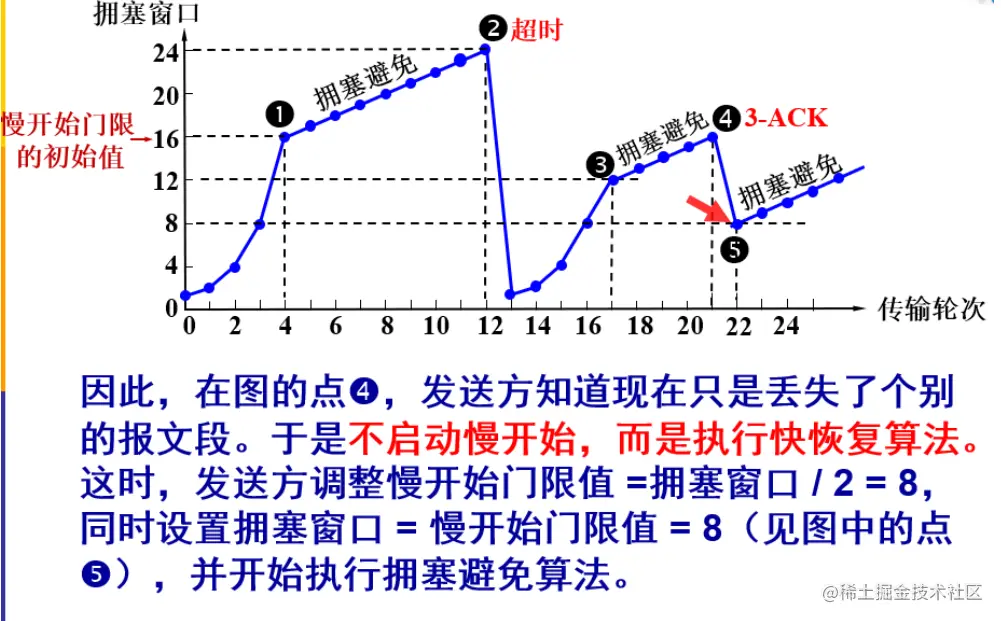 当网络出现拥塞的时候(出现超时重传),就调整 慢开始门限 = max(拥塞窗口/2,2),然后将拥塞窗口置1,开始执行慢开始算法,这样做的目的是迅速减少主机发送到网络中的分组数,让发生拥塞的路由器能有足够的时间处理累积的分组。