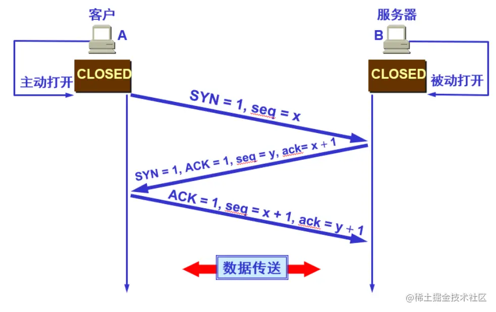 第一步:A的TCP向B发出请求报文段,同步位SYN=1,seq表示传送数据时第一个字节序号是x