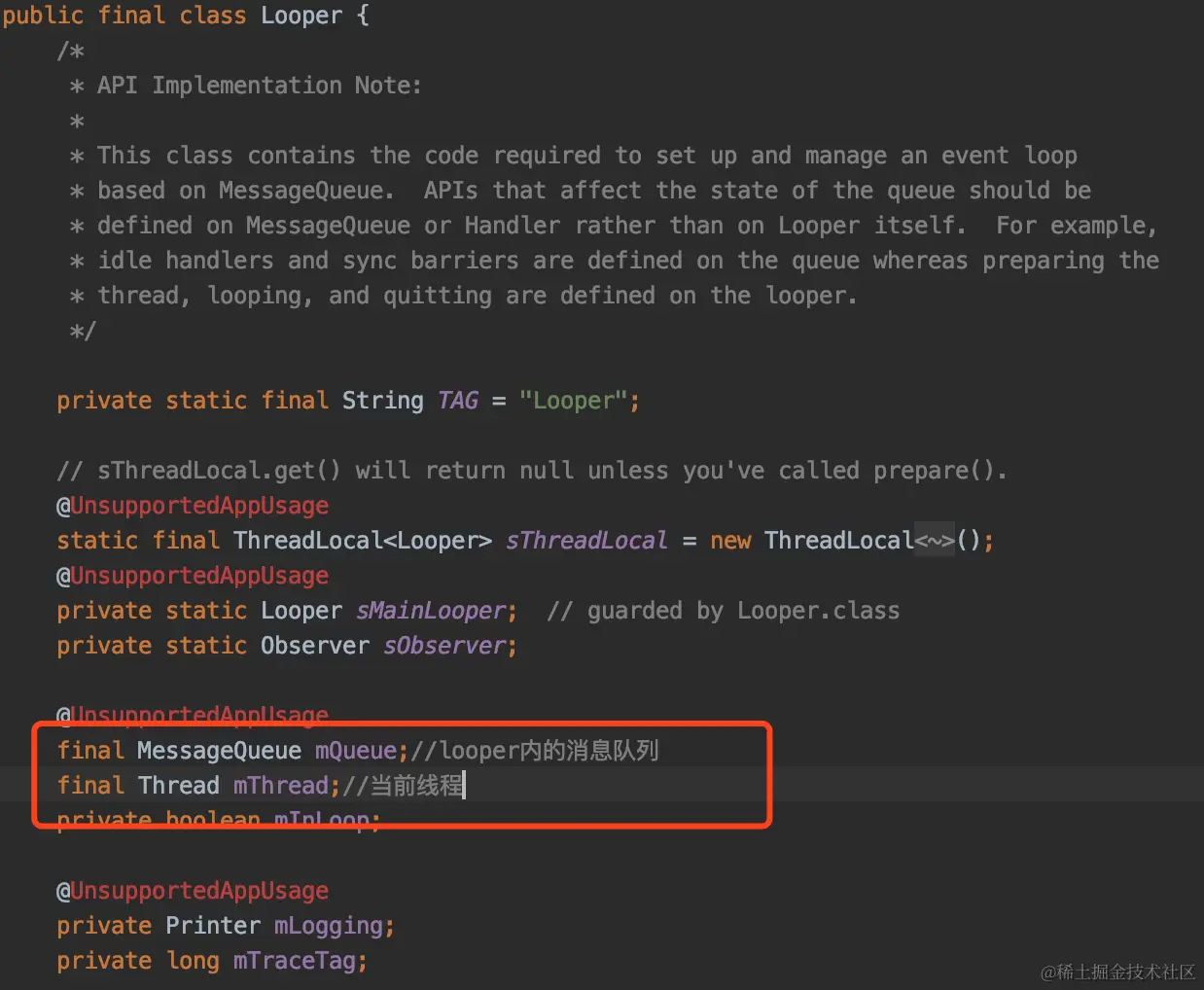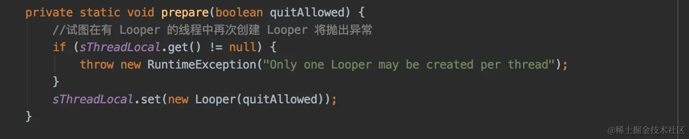 其实核心代码就两行,我们先来看下图 Looper.prepare()方法的具体实现