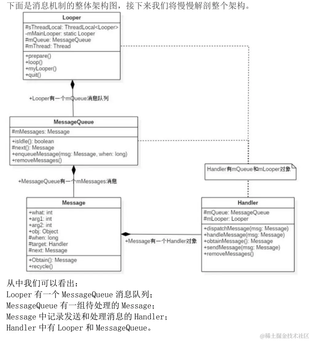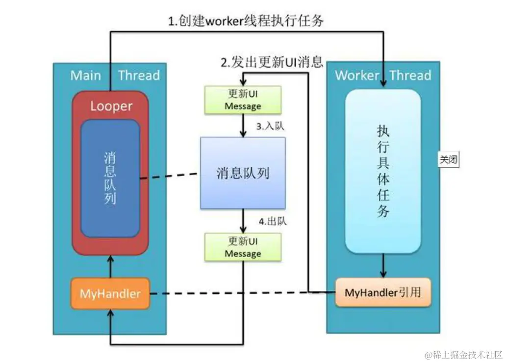 Message(消息)→MessageQueue(消息队列)→Looper(消息循环)→Handler(消息发送和处理)2. 四要素的交互过程