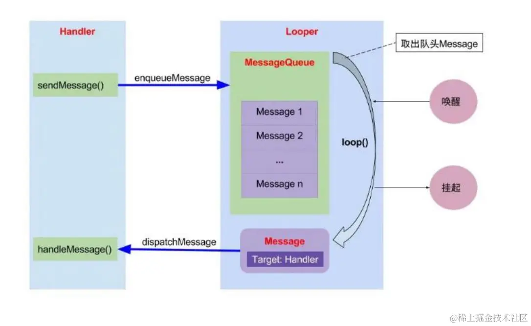 - Looper:不断循环执行(Looper.loop),从 MessageQueue 中读取消息,按分发机 制将消息分发给目标处理者。
