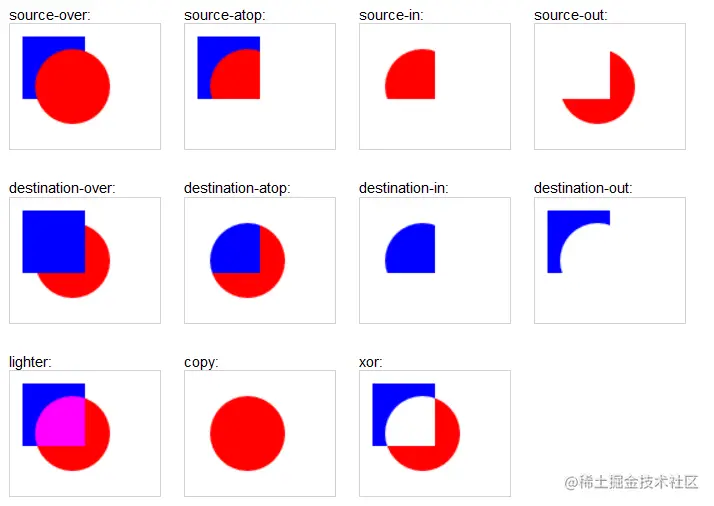 16. globalCompositionOperation各个取值效果如下,下图出自菜鸟教程: