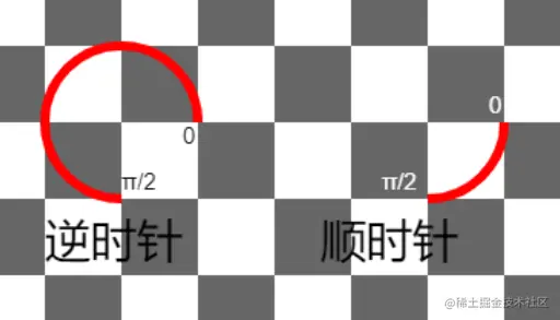 3. 使用context.arc()画的弧的角度从3点钟方向开始计算,角度用Math.PI来表示,比如90°为Math.PI/2,以同样的起始角度(0)和结束角度(Math.PI/2)绘图,最后一个参数分别为true(逆),false(顺)结果如下。