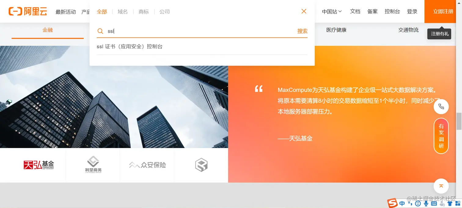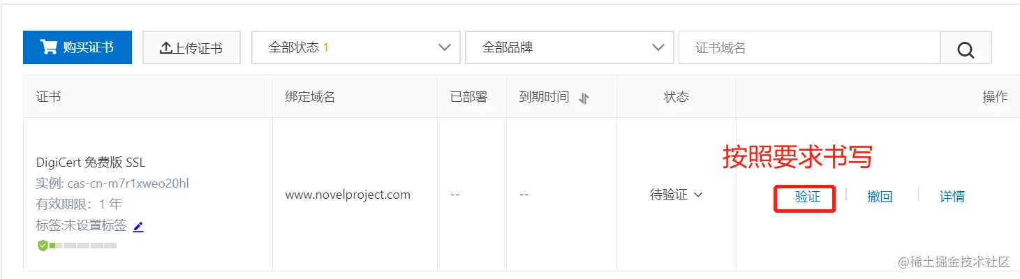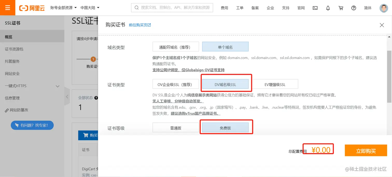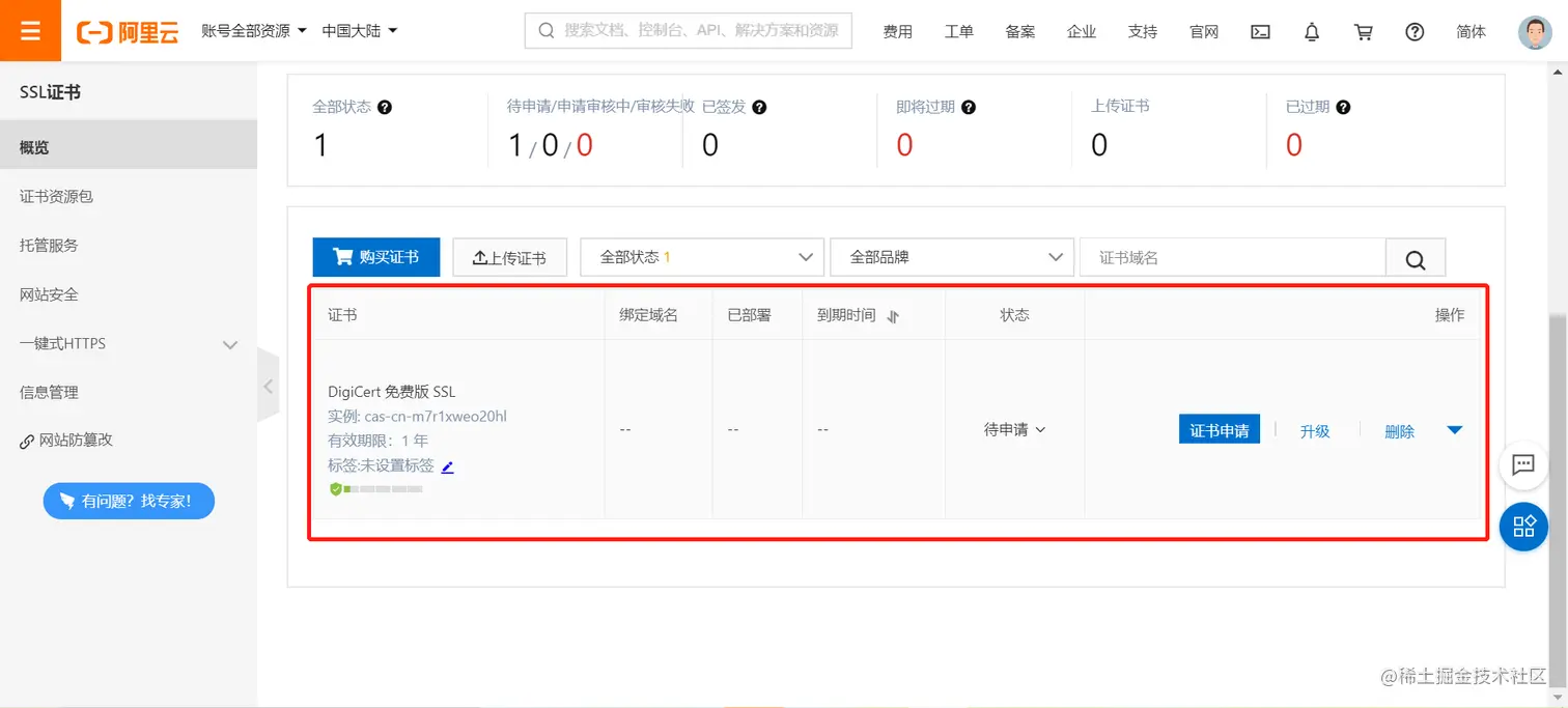 https_证书申请 Me酥 2020-12-02 159 阅读1分钟 https_证书申请 在阿里云中搜索SSL 证书 (应用安全) 点击购买证书,弹出弹框 按照图片中的选项进行选择免费的 返回购买证书的页面,点击申请,按照内容填写自己的相关信息 等待验证
