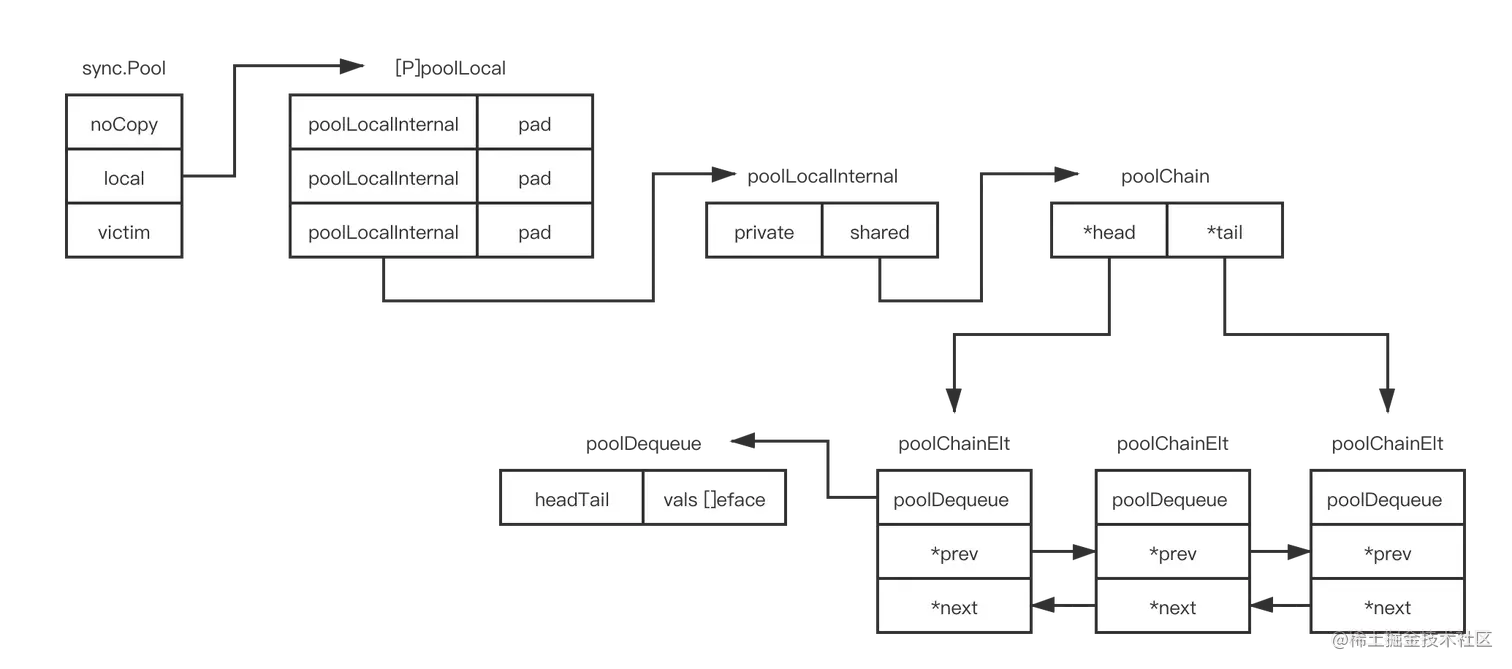 为什么官方不直接使用 poolDequeue,而是采用双向链表和 poolDequeue,主要原因是 poolDequeue 是固定大小的,所以使用双向链表来辅助扩容