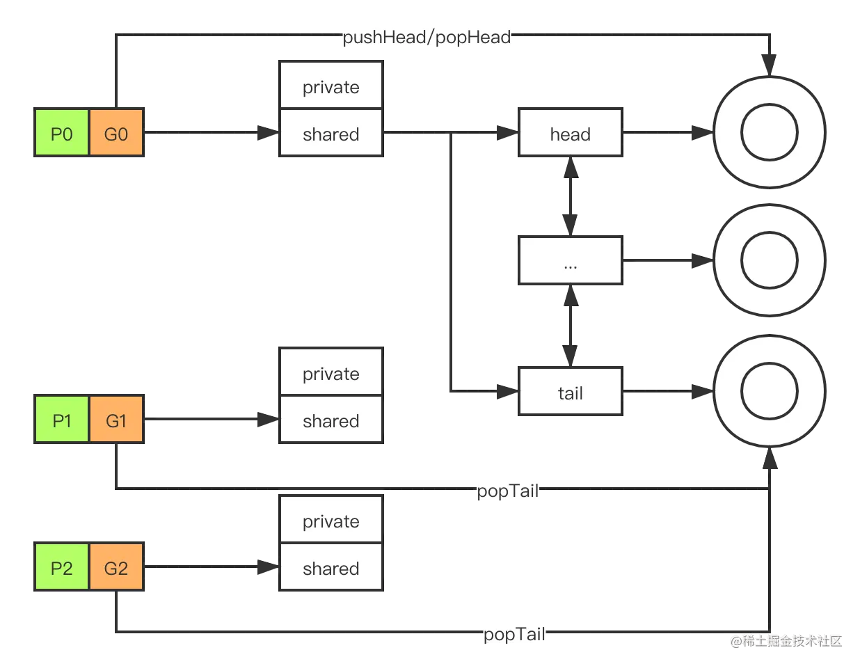 local和victim是指向缓冲池的指针private是私有数据,只有当前的 P 能操作shared是共享数据,是一个双向链表,只有当前的 P 能pushHead/popHead,任意 P 能popTail