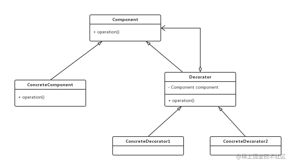 - 具体装饰器角色(ConcreteDecorator):向组件添加新的职责